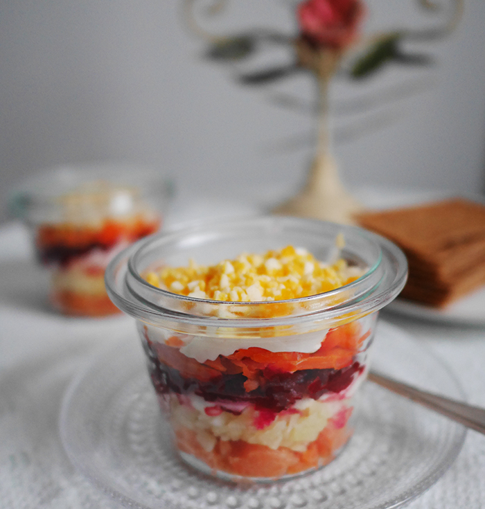 Zubereitung: Die Kartoffeln und Karotten in einem separaten Topf weich kochen, aber nicht zu weich. Auf Raumtemperatur abkühlen lassen. Kartoffeln und Karotten schälen. Eier kochen, abkühlen lassen und ebenfalls schälen. Den Lachs in kleine Stücke schneiden und in einer gleichmäßigen Schicht auf die Gläser verteilen. Die Kartoffeln raspeln und auf den Lachs verteilen. Mit fein gehackten Zwiebeln bestreuen. Die Hälfte der Mayonnaise auf der Zwiebelschicht verteilen. Die Rote Bete schälen und raspeln und auf der Mayonnaise verteilen. Dann die Karotten reiben und auf der Roten Bete verteilen. Die übrige Mayonnaise darüber geben. Ei fein raspeln und zum Abschluss darüber streuen. Vor dem Servieren mindestens 4 Stunden abkühlen lassen. Noch besser über Nacht.