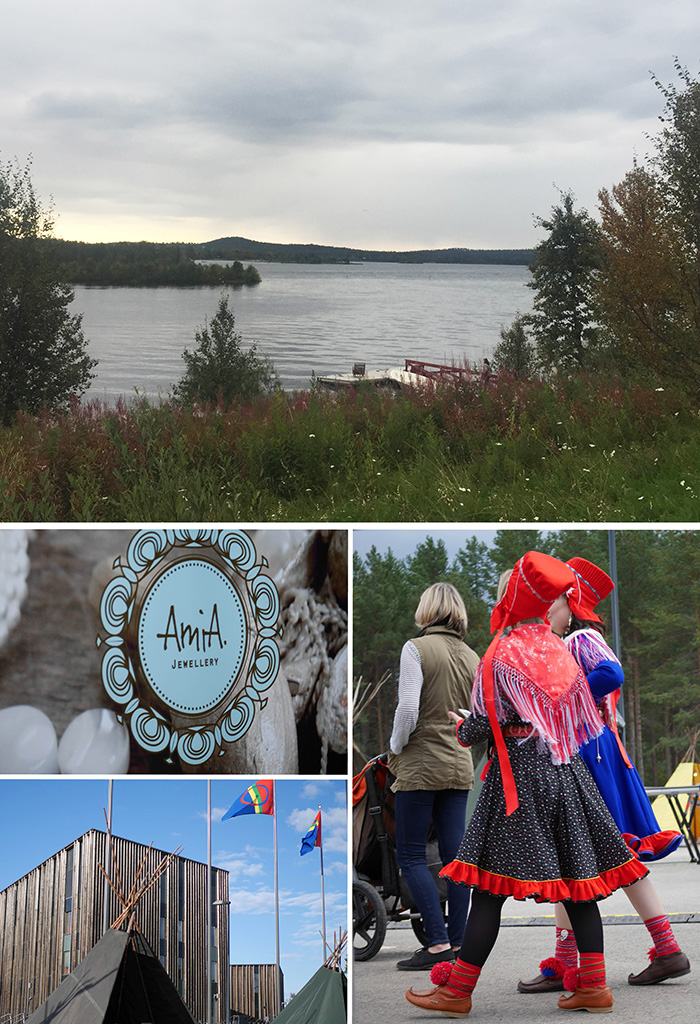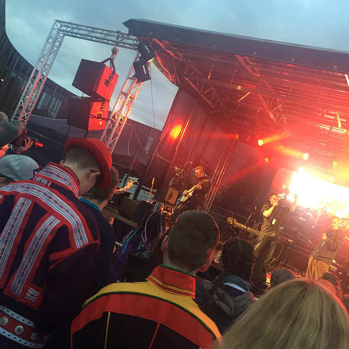 Nein, weder noch! Auch wenn ich mich zunächst hauptsächlich unter Touristen und spielenden Kindern befinde. Auf der Bühne wird noch der Soundcheck durchgeführt. Bei der Bar ist noch nichts los – sehr verdächtig für Finnland! Aber wen verwundert es, schließlich heißt Ijahis idja aus dem Samischen übersetzt „Nachtlose Nächte“ und nicht Five o`clock tea. Ich nutze die Zeit um mir die Verkaufsstände, die in Form von Tipis daher kommen, vorzunehmen. Erwerbe schon mal einige CDs. Ja, ich kaufe noch CDs! Auch wenn ich mich Dank Spotify schon mal vorab durch das Repertoire der Interpreten gehört habe. Bei den Schmuckständen drohe ich wiederholt schwach zu werden. Es gibt sowohl traditionelles als auch moderne Interpretationen samischer Handwerkskunst. Hinter den Ständen stehen meist junge hippe Leute. Wer hätte das gedacht, dass Punk- und Samistyle sich so gut vertragen? Aber mir war schon letztes Jahr auf dem Wintermarkt in Jokkmokk aufgefallen, dass gerade die neue Generation ihre samische Herkunft gekonnt und souverän zur Schau trägt.
