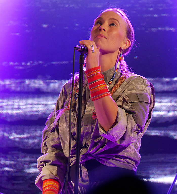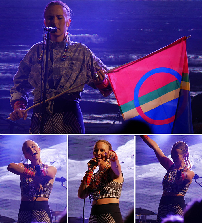 Was folgt, ist eine Show voller Emotionen, magischer Klänge und experimenteller Töne. Gekonnt katapultiert sie die Joik-Tradition in die Jetztzeit. Da sie nicht nur auf Nordsamisch, Schwedisch und Englisch singt, sondern auch auf Englisch erklärt, warum und wieso sie ihre Lieder geschrieben hat, geht ihr Auftritt auch an mir nicht spurlos vorbei. Sie erzählt davon, dass sie beim Film “Avatar” weinen musste, als sie feststellt, dass es eigentlich gar kein Science-Fiction–Film ist, sondern er genau das erzählt was ihren Vorfahren ihrer Kultur, Sápmi wiederfahren ist. Ich merke wie das Mädchen neben mir schnieft. Als sie später die samische Flagge auf der Bühne schwingt, kommen “Sami-Power”-Rufe aus dem Publikum. Eins ist klar, das Publikum liebt sie! Und mir gibt sie viel zum Nachdenken mit auf meinen Weg.