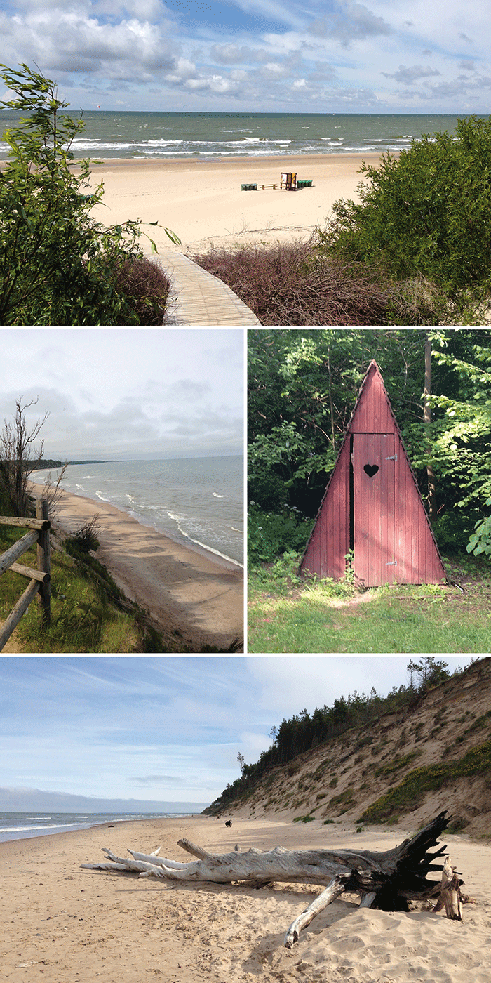 Mein nächstes Ziel hieß also Palanga. Seit ich dort das erstemal 1992 im Rahmen eines Schüleraustausches war, übt dieses Seebad eine seltsame Anziehungskraft auf mich aus. Ich liebe es durch die schachbrettförmig angelegten Straßen zu flanieren, mit ihrem Charme der alten Zeit, der bis heute erhalten geblieben ist, die alten Holzhäuser und baumbestandene Allen. Denn bereits im 19. Jahrhundert war Palanga ein beliebter Ferien- und Kurort, daran änderte sich auch nichts zur Sowjetzeit, die natürlich hier und da auch ihre Spuren im Stadtbild hinterlassen hat. Eigentlich kannte ich Palanga bisher nur im Herbst mit seinen netten kleine Restaurants, langen Strandspaziergängen, alles sehr beschaulich. Als ich diesesmal dort ankomme, geht es auf der langen Strandpromenade zu wie am Lido im Hochsommer. Obwohl das Autothermometer nur 18 Grad anzeigt, in der Sonne ist es warm, die Kiefernwälder duften – herrlich! Leider sind Hunde am Strand verboten, daher mache ich nur einen kurzen Abstecher dorthin. Aber es ist sowieso viel zu windig und kein Einheimischer ist direkt am Wasser zu sehen. Nein sie haben sich alle an geschützte Stellen in den Büschen versteckt und räkle sich dort in der Sonne. Das mit dem Badeoutfit lasse ich, aber ein Eis geht immer. Und nach einem schönen Hundespaziergang durch den strandnahen Kiefernwald geht es weiter die Küste entlang, nordwärts nach Lettland.